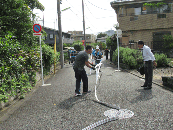 白いヘルメットを被っているのが訓練参加者の砧町町会役員です。