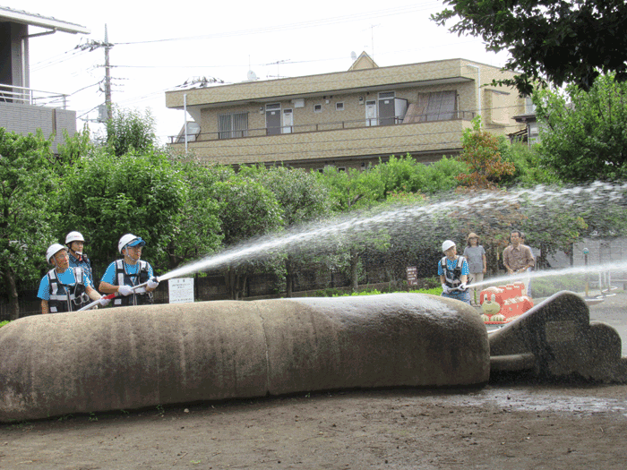 放水中です。ブランコの奥では、砧町自治会の皆さんが筒先の到着を待っています。