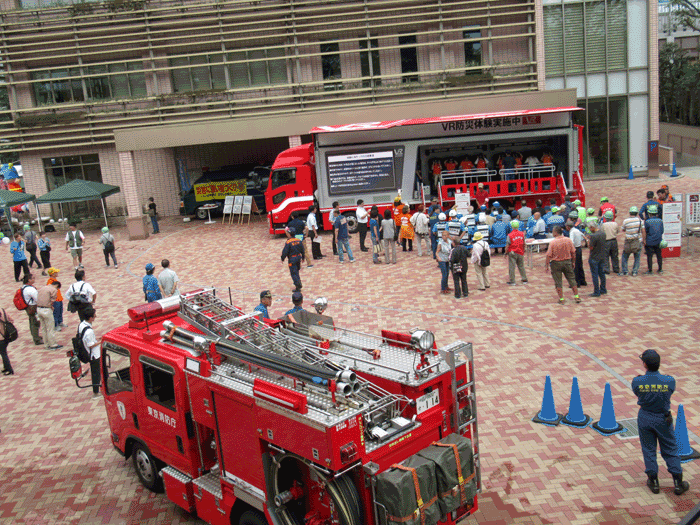 VR防災体験車がメイン会場の日大商学部に来てくれました。東京消防庁が初めて導入した最新体験車です。VR防災体験車とはモーションシート(映像に合わせて動く椅子)に座り、ヘッドマウントディスプレイのバーチャルリアリティ映像と、揺れ、匂いなどの演出により、災害を疑似体験する車両のことです。