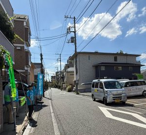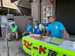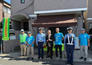 「秋の全国交通安全運動」4日目の幕舎には、成城交通安全協会の島田会長が、成城警察署長とご一緒にお見えになりました。