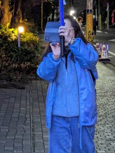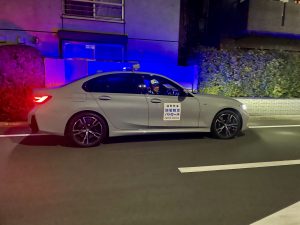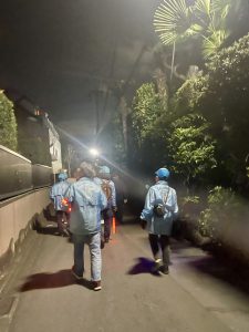 「夜回り」に先立ち、午後6時からは「青色回転灯パトロール」で、原岡理事の青パトで町内を走り、足立理事、長島滋子理事が防犯、防災をアナウンスして回りました。