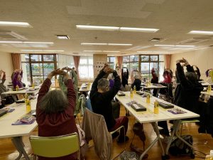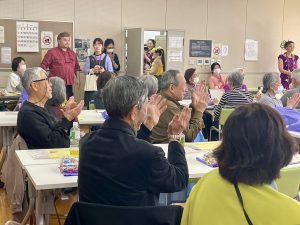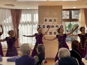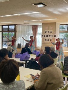 「きぬた75歳からの交流会」は、砧あんしんすこやかセンター(包括支援センター)の職員さんによる体操とお話、そして「亀戸升本」のお弁当、レイアロハフラスタジオの素敵なステージ、そして、阪西委員による楽しい歌の時間、という豪華なプログラムでした。