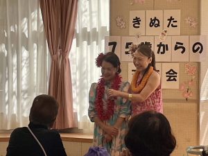 さらに「お楽しみ会」として、レイアロハフラスタジオによるフラ、そして民生児童委員の阪西さんのピアノとリードでの歌の時間があります(^^♪